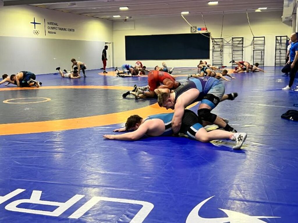 Viron ja Suomen painimaajoukkueet harjoittelemassa Urhea-hallissa