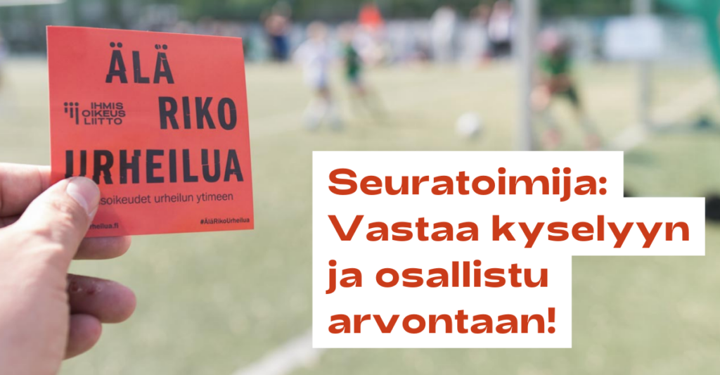 10.03.2026 Älä riko urheilua -työ suuntautuu tulevina vuosina entistä ihmisoikeuksien vahvistumiseksi urheiluseurojen arjessa. Vastaa Ihmisoikeusliiton kyselyyn ja osallistu paita-arvontaan! Ihmisoikeusliitto aloittaa valikoitujen seurojen kanssa yhteiskehittämisprosessin, jonka tarkoituksena on luoda laajasti eri seurojen käyttöön tarkoitettu Ihmisoikeudet urheiluseuroissa -malli, joka sisältää erilaisia hyviä käytäntöjä ja työkaluja ihmisoikeuksien edistämiseksi seuran arjessa. Työnsä tueksi Ihmisoikeusliitto kerää seuratoimijoilta tietoa ihmisoikeushaasteista, niitä koskevista tarpeista sekä jo olemassa olevista hyvistä käytännöistä. Urheilussa ihmisoikeusteemoja ovat muun muassa: Yhdenvertaisuus ja sukupuolten tasa-arvo Lapsen oikeudet Rasismiin puuttuminen ja antirasismi Häirinnän kitkeminen Vammaisten ihmisten oikeudet Seksuaali- ja sukupuolivähemmistöjen oikeudet. Vastaaminen kestää noin 5 minuuttia. Kysely on anonyymi ja vastauksia käytetään Ihmisoikeusliiton kehittämistyön tukena.ARVONTA: Kyselyyn vastattuasi voit osallistua Älä riko urheilua -paidan arvontaan. Arvonta sulkeutuu 31.3.2026. *Urhea ei ole mukana arvonnan järjestämisessä.Lisätietoja Ihmisoikeusliiton asiantuntija Samuel Bashmakovilta: samuel.bashmakov@ihmisoikeusliitto.fi Vastaa Ihmisoikeusliiton kyselyyn tästä